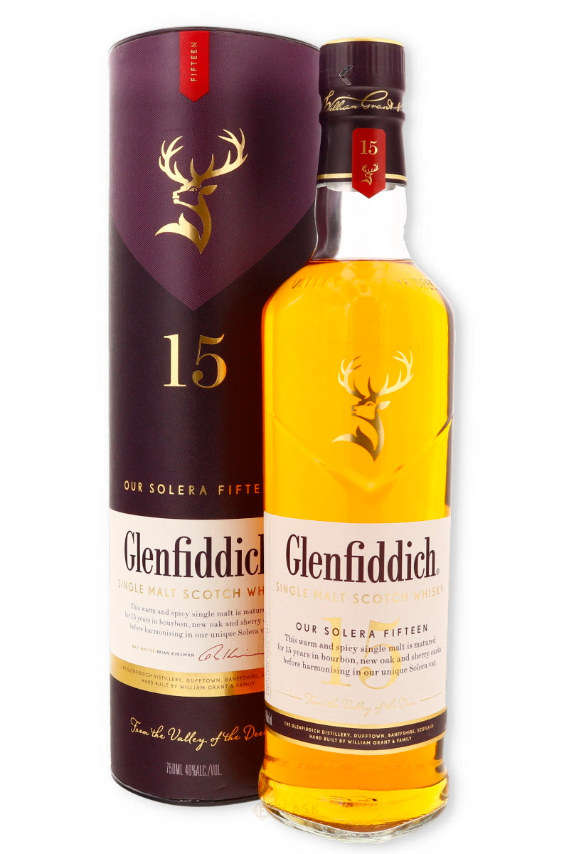 Glenfiddich 15 Year Old Solera Reserve single malt Scotch whisky is created using a technique pioneered by our Malt Master and its warm spicy flavors are transformed with the alchemy of the Solera Vat. Best enjoyed neat on the rocks with a splash of water or with club soda to expand the flavor.