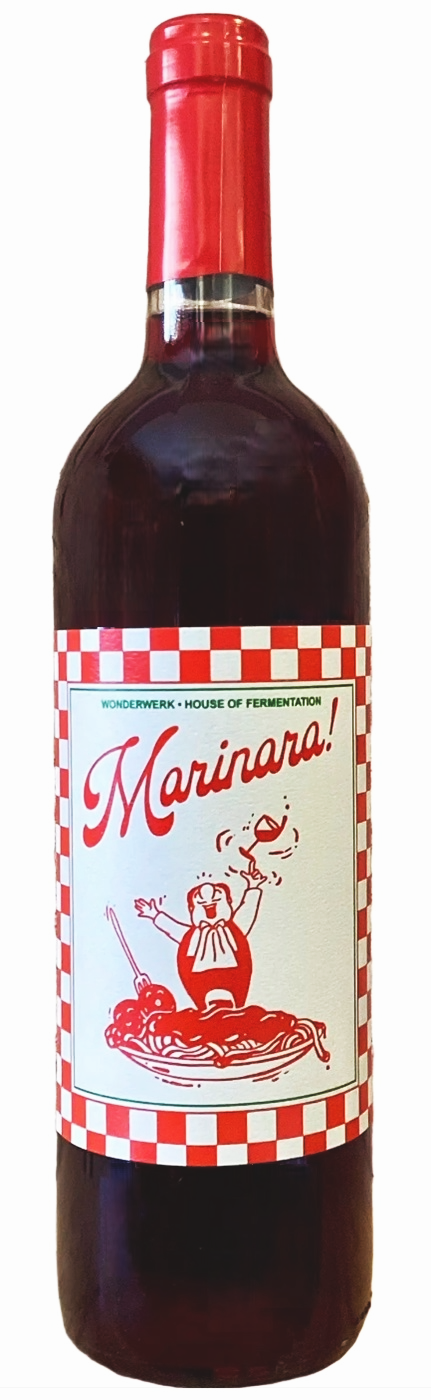 Wonderwerk Marinara NV (2024) is a California red blend made from organically farmed grapes in Contra Costa County. The blend comprises Montepulciano (50%), Teroldego (20%), Zinfandel (20%), and Grenache (10%). Winemakers Issamu Kamide and Andrew Lardy employ carbonic maceration followed by spontaneous fermentation with native yeasts. The wine ages five months in neutral oak barrels. Bottled unfined and unfiltered with minimal sulfur additions, this natural wine reflects hands-on production methods and sustainable vineyard practices across California's diverse growing regions.